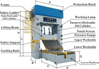 Upper and lower working benches and guide rails of pressure-plate vertical die spotting machine are made from nodular cast iron, with advantages of sound flatness, high precision and small deformation. - 7. The die spotting press is equipped with security facilities.